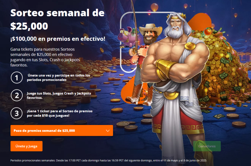 Únete una vez y participa en todos los periodos promocionales. Juega tus Slots, Juegos Crash y Jackpots favoritos. ¡Gana 1 ticket para el Sorteo de premios por cada $10 que juegues!