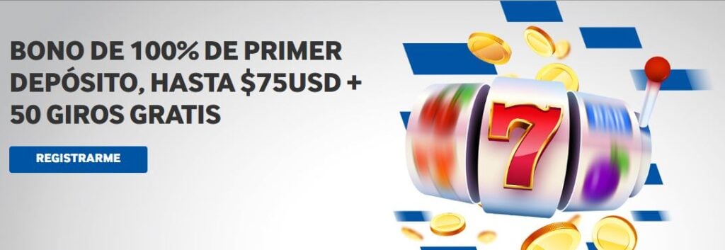 Es una promo de bienvenida que otorga el 100% del primer depósito hasta un máximo de 75 USD. La oferta se completa con 50 giros gratis en tragamonedas.