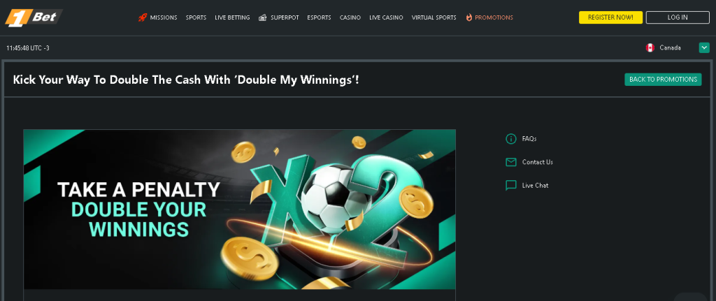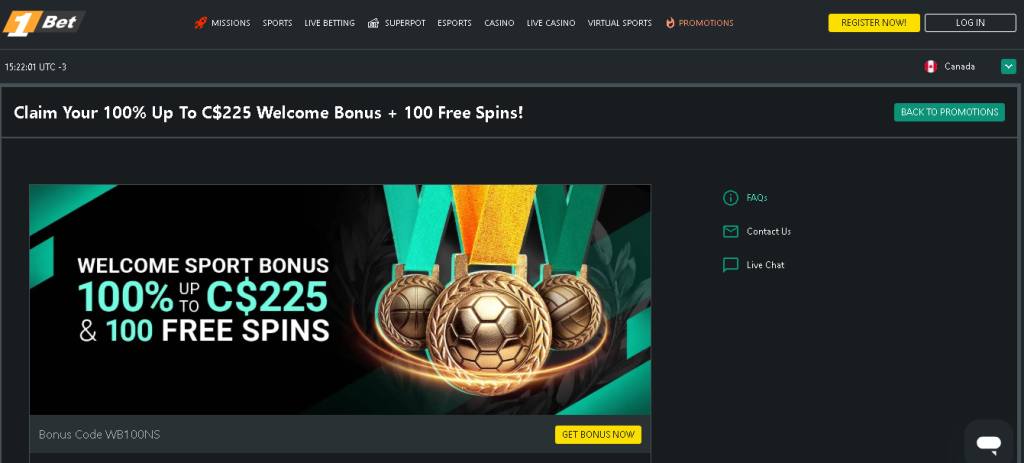 For all users from Canada (except Ontario), 1bet has a fantastic Welcome Bonus for Sports Betting. You will have the possibility to add extra funds to your bets and increase your chances of winning. But that’s just the beginning. Then you can enjoy many other benefits, such as Free Bets, increased odds and much more. Start with up to C$225 EXTRA + 100 Free Spins!