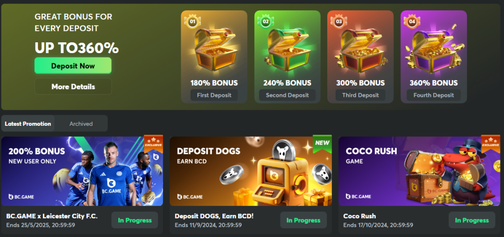 Bc.Game360% extra on 4 initial depositsDoes not have