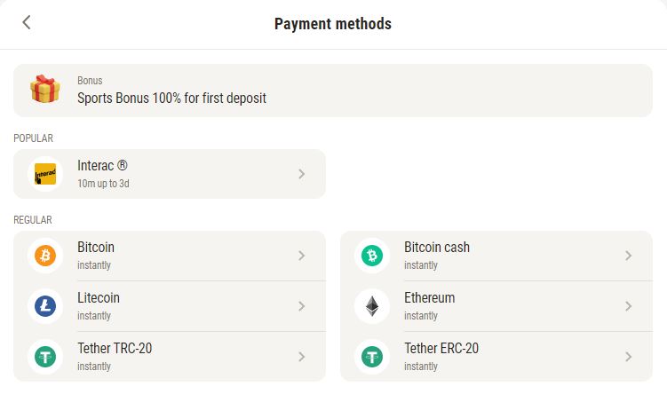 Deposits via Interac can take anywhere from 10 minutes to 3 business days, depending on bank processing. However, if you prefer a faster method, cryptocurrencies are the ideal option, as transactions are processed instantly. This makes cryptocurrencies the most efficient way to fund your account and start enjoying betting without delay.