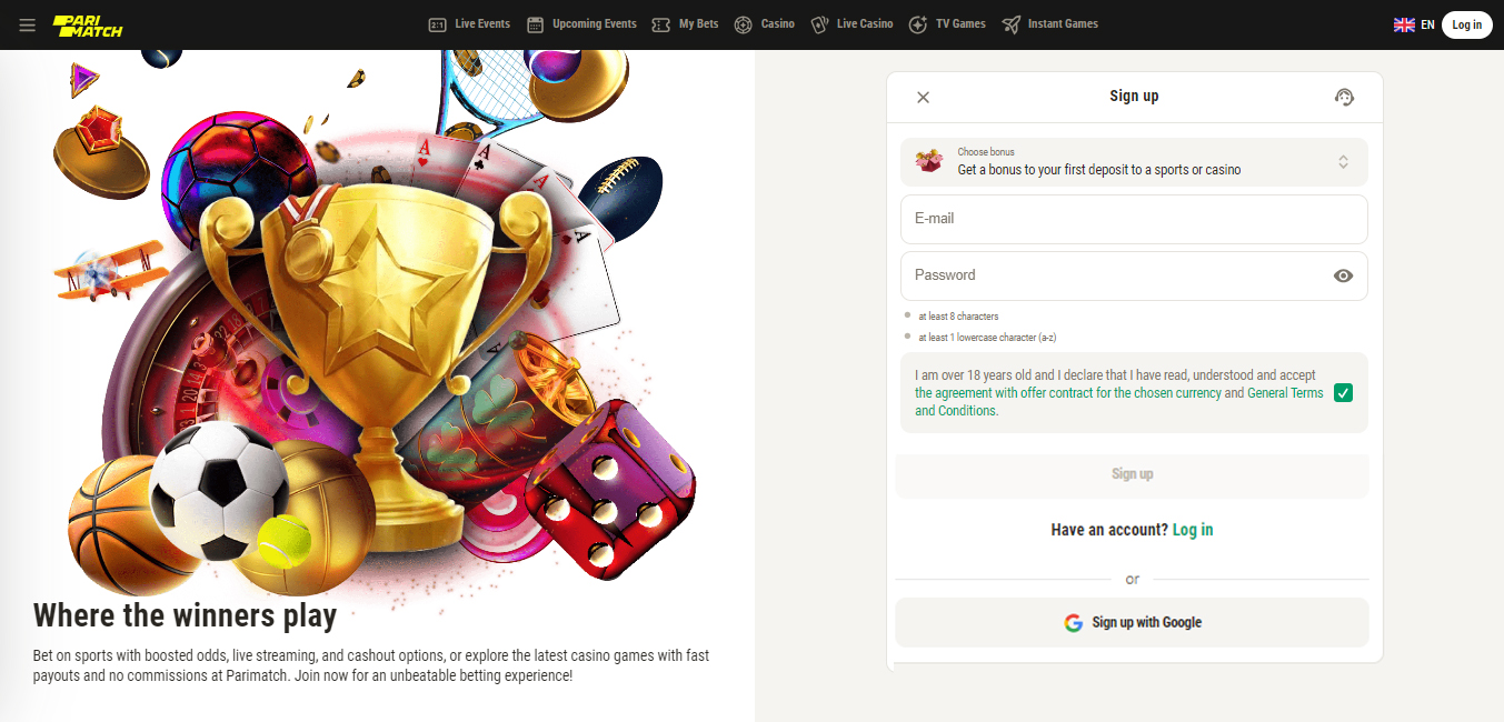 The first step to access the bonuses is to create an account on Parimatch. To do this, visit the official website and click on the Sign Up button. Then fill in the form with your personal details, such as name, email and passworw. And don’t forget to choose your welcome bonus!