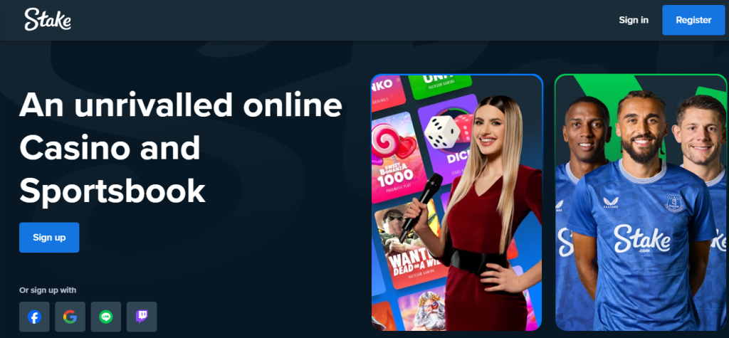 - Register your account for the first time on the site. To do so, simply complete the registration form requested by Stake or link your Google, Facebook, Line or Twitch account. Fast and free registration.