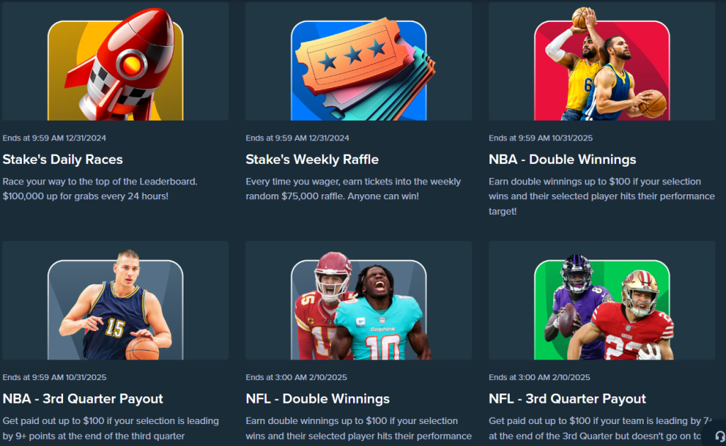 Stake Promotions catalog stands out for the value of the Bonus offered and for the variety of benefits for sports betting fanatic customers in Canada. Always remembering, of course, that Stake offers are not available to the Ontario public.
