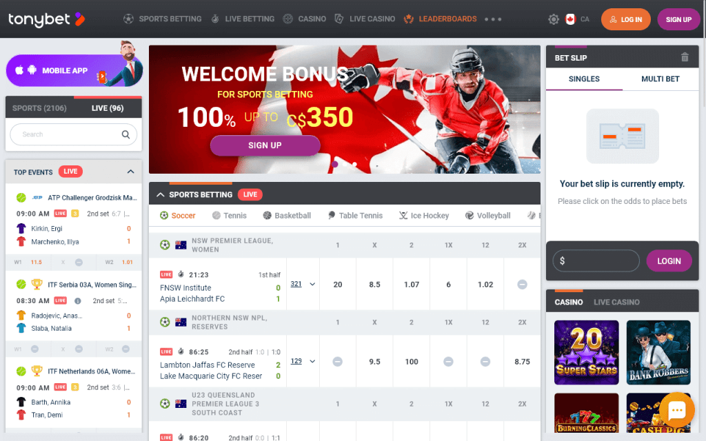At the moment, Tonybet bonuses are not available to players in Ontario. We leave you an article about The best casino and sports betting bonuses in Canada. Compare all the offers and choose the most suitable one according to your preferences.