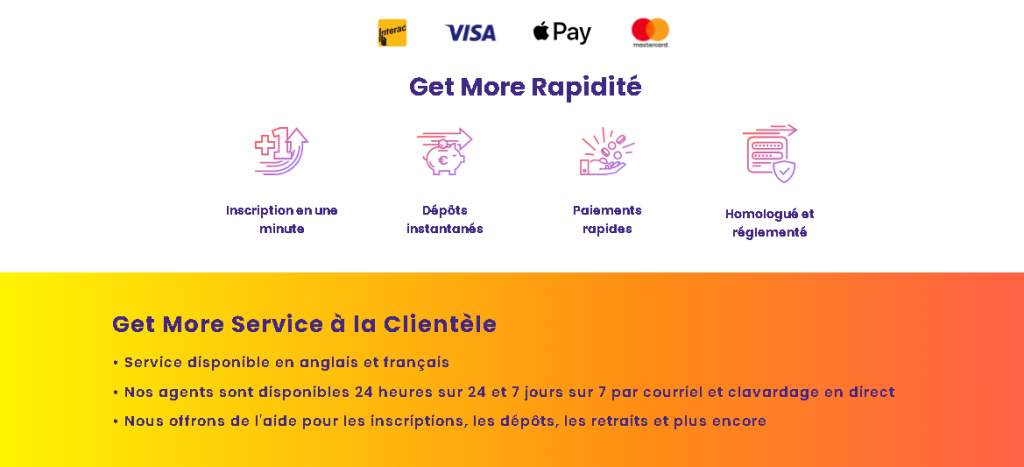 VISA, MasterCard, Interac e-Transfer, MuchBetter, Payz et MiFinity eWallet sont les principaux modes de paiement acceptés au Canada.