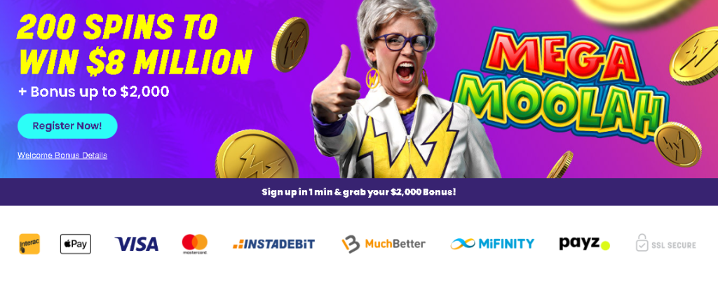 Il s’agit d’un bonus de bienvenue, c’est-à-dire exclusif aux nouveaux utilisateurs. Il s’agit d’un bonus de 100 % sur votre premier dépôt jusqu’à 1 000 $ + 200 tours gratuits pour le jeu Mega Moolah.