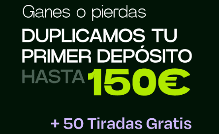 Empieza a apostar ahora en RETAbet con su bono de bienvenida de hasta 150€. Te duplican tu primer depósito hasta 150€ después de que hayas hecho tu primera apuesta, independientemente de que la ganes o la pierdas. Además, también te regalan 50 tiradas gratis para utilizarlas en su casino. Te recomendamos que eches un vistazo a la review del bono de RETAbet.