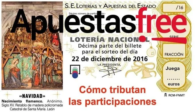 Tirbuta como el resto de premios a un 20 % y para premios superiores de 2.500 €, pero tienes que tener en cuenta que es sobre el premio que recibe el décimo si tu llevas una papeleta en la que juegas 10 € y el décimo recibe un premio de 3.000 €. Tu tienes que tributar por el 50 % del 20 % de ese premio de 3.000 € aunque tu realmente vayas a recibir 1.500 €