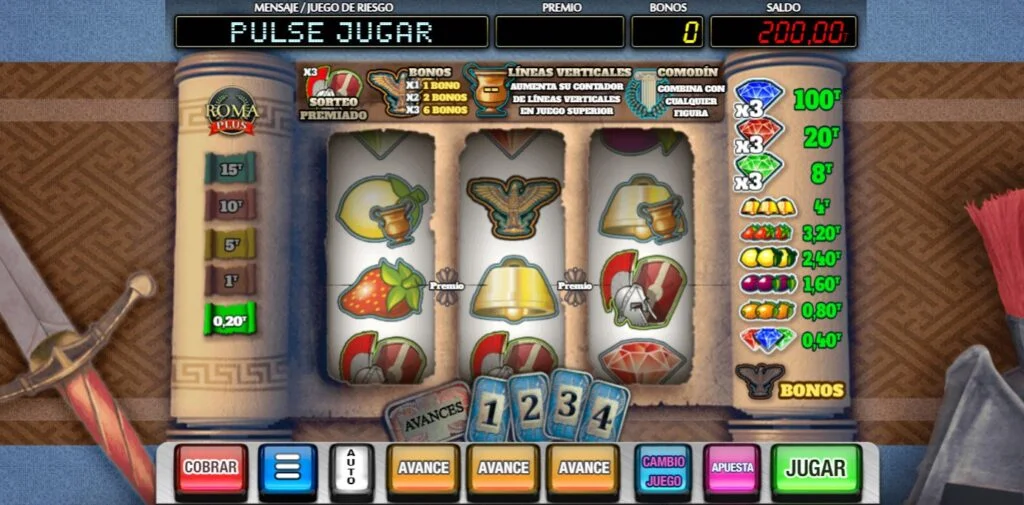 Roma Plus es una slot desarrollada por un auténtico gigante especalista en slots clásicas de bar: MGA. Al igual que las tragaperras de este tipo, cuenta con dos modos de juego: el inferior (base desde el que comenzamos a jugar) y el superior (de bonificación, con mayores premios y acceso a la mayor parte de los minijuegos), además de una cuadrícula de 3×3 con una sola línea de pago, que se encuentra en la línea central.