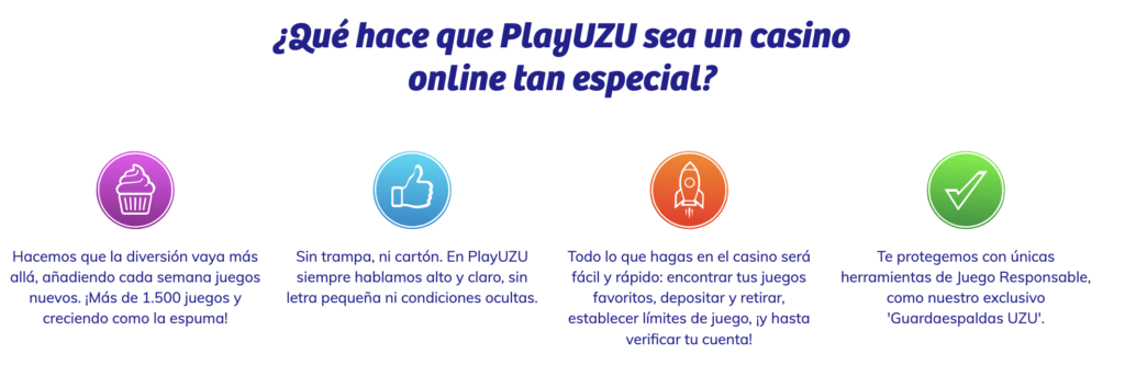 Lo novedoso de Play UZU Casino es su filosofía de que sus jugadores tengan más libertad a la hora de jugar. Creemos que se trata de una apuesta sincera y que será sostenida en el tiempo. En sus primeros meses como operador online han demostrado ser diferentes, y eso es una gran forma de llegar a la gente.