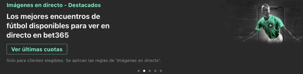 Efectivamente uno de sus servicios que ofrece bet365 es la retransmisión en directo de más de 380 eventos deportivos al día de media, en los que puedes apostar en vivo. Es cierto que muchas casas de apuestas ofrecen en streaming los principales eventos deportivos pero en algunas la calidad de la retransmisión es más que cuestionable. No es el caso de Bet365, la calidad de su imagen es muy buena, en la mayoría de las ocasiones es en alta resolución.