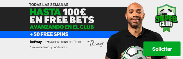 Betway ofrece a sus nuevos usuarios una oferta de bienvenida para apuestas deportivas tremendamente interesante. Con su bono, en el caso de que falles tu primera apuesta, te devuelven el 100% de la cantidad apostada en forma de freebets, hasta un máximo de 200€. Además, te regalan 50 freespins para disfrutar de 2 de sus mejores slots.