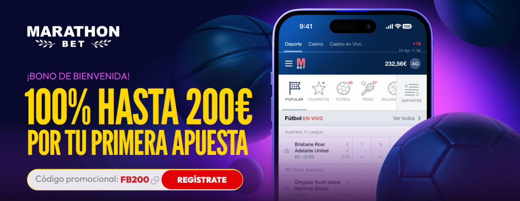 Para obtener el bono, debes registrarte en Marathonbet, hacer tu primer depósito de al menos 10€ y utilizar el código promocional FB200. Luego, realiza una apuesta de al menos 5€ a una cuota máxima de 4.00.