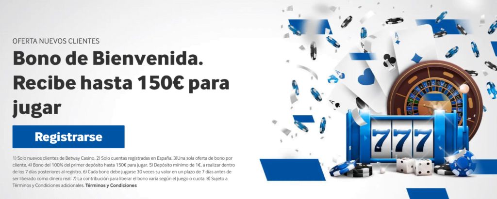 ¡Regístrate en betway.es y aprovecha su bono de hasta 150€ para jugar a las slots, ruletas y bingos de su casino!
