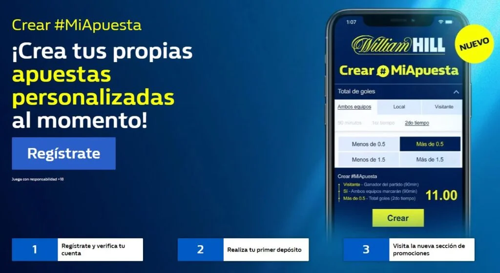 Por una parte, puedes apostar tanto desde la App William Hill como desde la web para móviles. Y, en ambos servicios está disponible su sistema ‘Crear #MiApuesta’, con el que podrás combinar pronósticos de un mismo partido para crear cuotas realmente grandes.