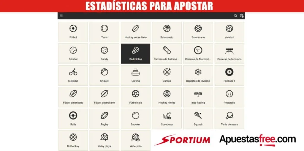 Algo que nos llama especialmente la atención de Sportium es la sección de estadísticas de casi todos los deportes en los que se puede apostar. Esto nos parece un gran punto a favor, ya que es estudio de las estadísticas previas de los participantes en los eventos nos pueden ayudar a la hora de decantarnos al hacer nuestros pronósticos.