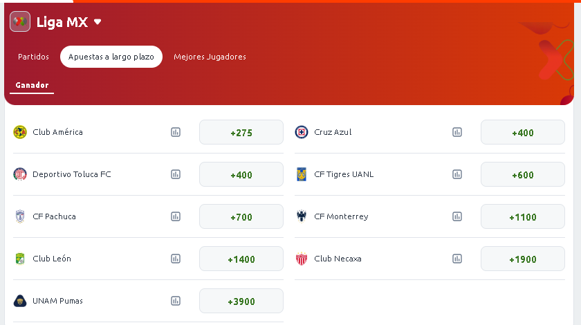 Y ahí no termina la cosa, porque también está la posibilidad de apostar a largo plazo. Como por ejemplo quién ganará la Liguilla y se convertirá en el campeón del fútbol mexicano. Para todo hay grandes cuotas en Betano.