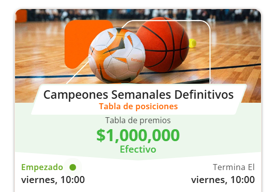 ¡Se trata del Torneo Campeones Semanales Definitivos en el sitio de Betsson! Acumula más puntos que nadie en la competencia y participa por una bolsa de premios de dinero en efectivo de $1.000.000. Torneo que comenzó el día 4 de abril, finaliza el día 11 de abril y acepta a todos los clientes con una cuenta activa en el sitio. ¡Te toca a ti apostar en Betsson México!