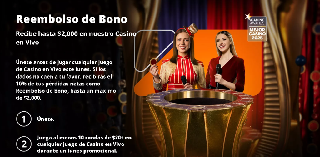 • REEMBOLSO EN CASINO EN VIVO: todos los lunes, puedes recibir hasta $2.000 MXN de reembolso en tus jugadas en el casino en vivo de Betsson. Se aplica el 10% de devolución sobre lo perdido ese día de la semana. Tendrás que jugar al menos 10 rondas de $20 MXN o más en cualquier mesa de casino en vivo.