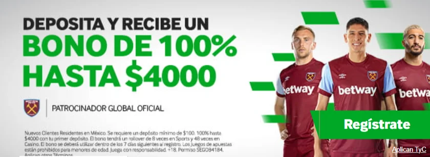 | Betway | 100% extra hasta $4.000 MXN de Bono en el 1er depósito |