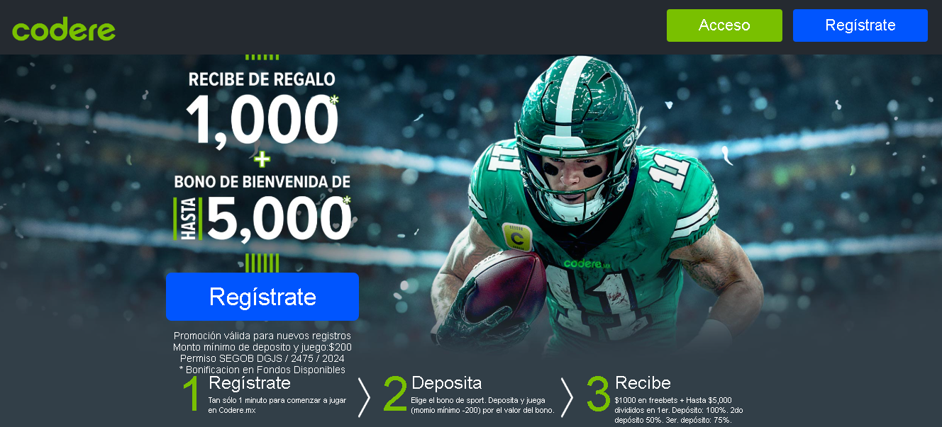 Aprovecha la promo de Codere para el SuperBowl de la NFL. ¡Suma $1.000 gratis para apostar + $5.000 repartidos en tres depósitos!