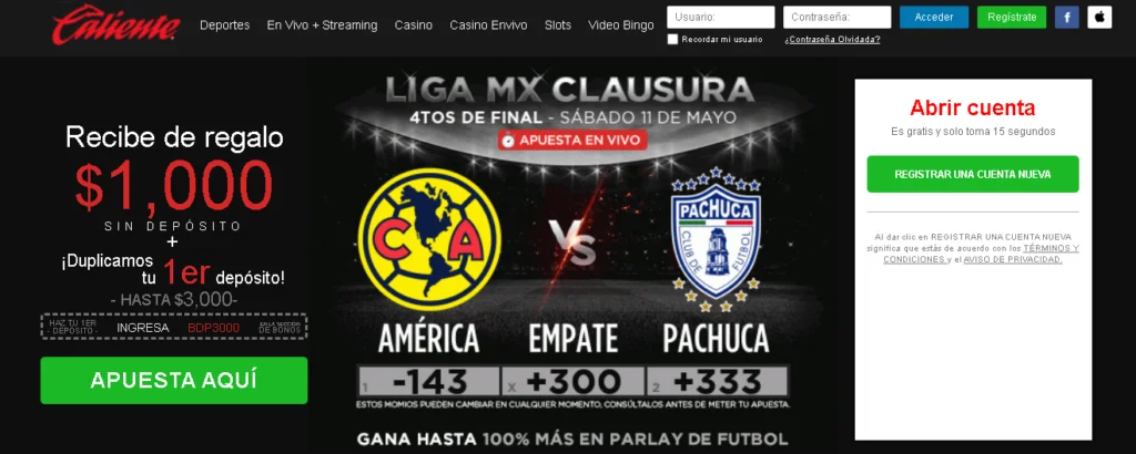 Ya sabes como depositar y retirar dinero en Caliente.mx. En el caso que desees realizar un ingreso de saldo, este es el momento en el que puedes obtener uno de los bonos de bienvenida. Recuerda, en este sentido, que hay un bono de hasta $3.000 MXN para apuestas deportivas y otro de hasta $5.000 MXN para casino. ¡Elige el Bono que quieras!