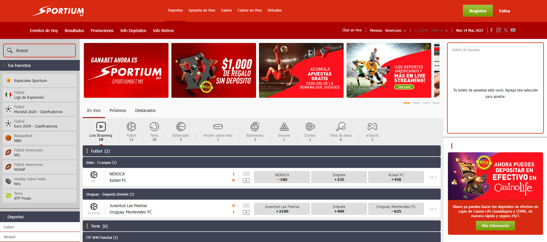 Dentro de las salas virtuales de Sportiumbet en México podrás encontrar juegos de casino como: Tragamonedas, Jackpots, Juegos de Mesa, Bingo, Ruleta, Video slots y mucho más. Cuentan con toda una sección de Casino en vivo, y un catálogo deportivo completo, con capacidad en Directo y promociones especiales para usuarios registrados.