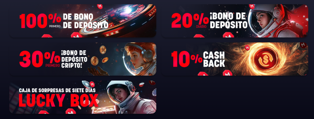 Hay Bonos Diarios del 20% por depósito hasta $2.000, para disfrutar en el casino y el casino en vivo. Además, Marsbet posee un bono especial para criptomonedas y un 10% de reembolso en efectivo, sin requisitos de apuesta.