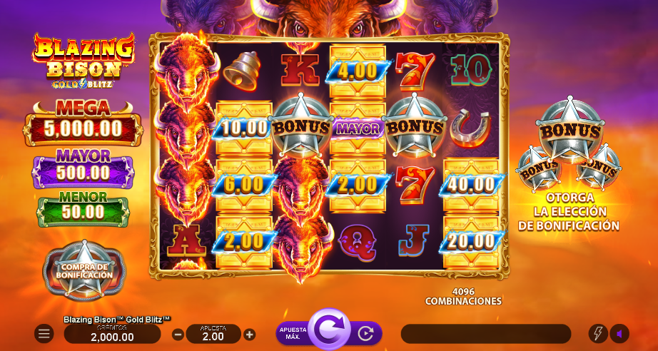 Todavía hay más por contar con respecto a Blazing Bison Gold Blitz. Porque esta tragamonedas ofrece distintas versiones de rondas de bonificación, que pueden ser elegidas por el jugador. Mayor número de Giros Gratis con características adicionales o un número menor de giros Gold Blitz que se centran en premios más grandes.