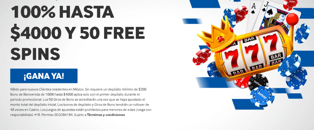 Para disfrutar en los mejores juegos de casino, los que repasamos aquí y otros, Betway tiene un Bono de Bienvenida imperdible en México. Con él, tendrás la chance de duplicar el valor del primer depósito hasta la suma de $4.000 MXN. Una oferta fantástica, sin dudas de las mejores en México.