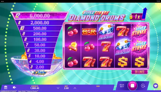 Hyper Strike Doamond Drums pertenece a los proveedores Games Global y Gameburguer Studios. Los símbolos del juego son cerezas, BAR, campanas, signos de dólar y tres tipos de 7.