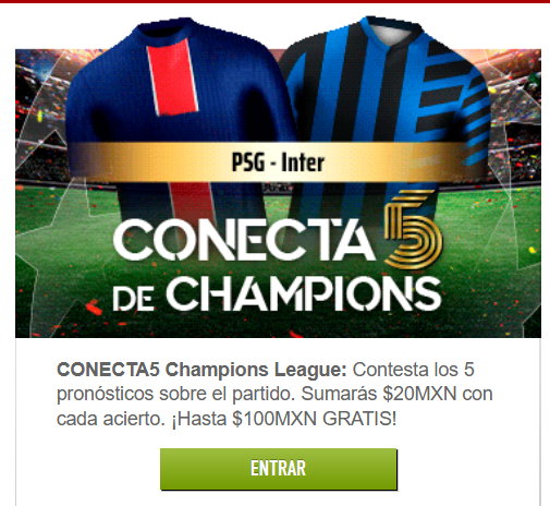 Aprovecha la Promoción “Conecta 5 y gana 100 MXN en la Final de la Champions League” en Sportiumbet y gana hasta $100 MXN por cada uno de tus aciertos en el partido que protagonizan PSG e Inter. ¡Participa de forma gratuita! Es decir, solo deberás contestar las 5 predicciones que Sportiumbet propone y, por cada acierto, recibirás $20.
