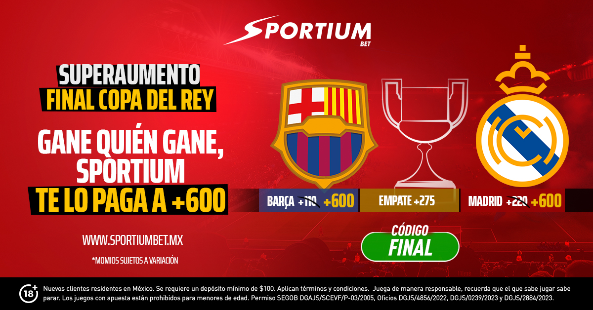 El Superaumento de Sportiumbet en la final de la Copa del Rey está disponible para todos aquellos que apuesten en el partido y que se hayan registrado a partir del pasado 14 de abril. Además, tienen que ser residentes de México y mayores de 18 años.