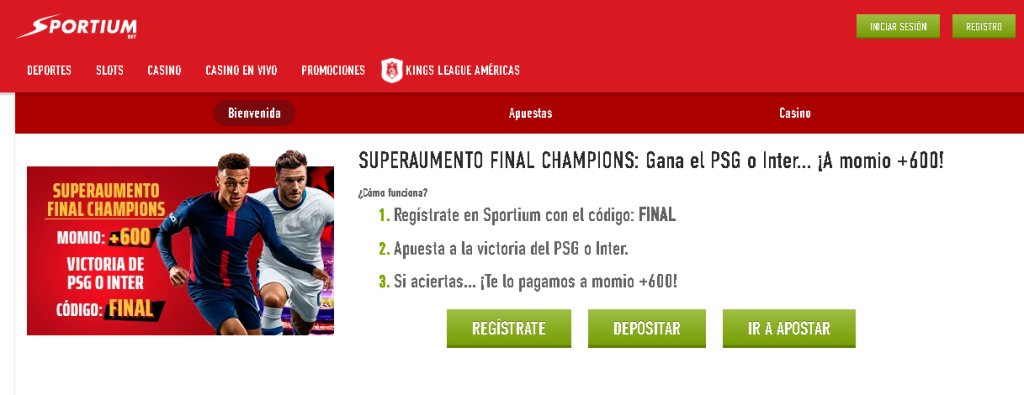 En el proceso del registro, debes utilizar el código promocional FINAL en la casilla correspondiente. Luego apuesta a la victoria de Inter o PSG y se activará la Supercuota. Si quieres más, repasa el Bono de Sportiumbet para Apuestas Deportivas.