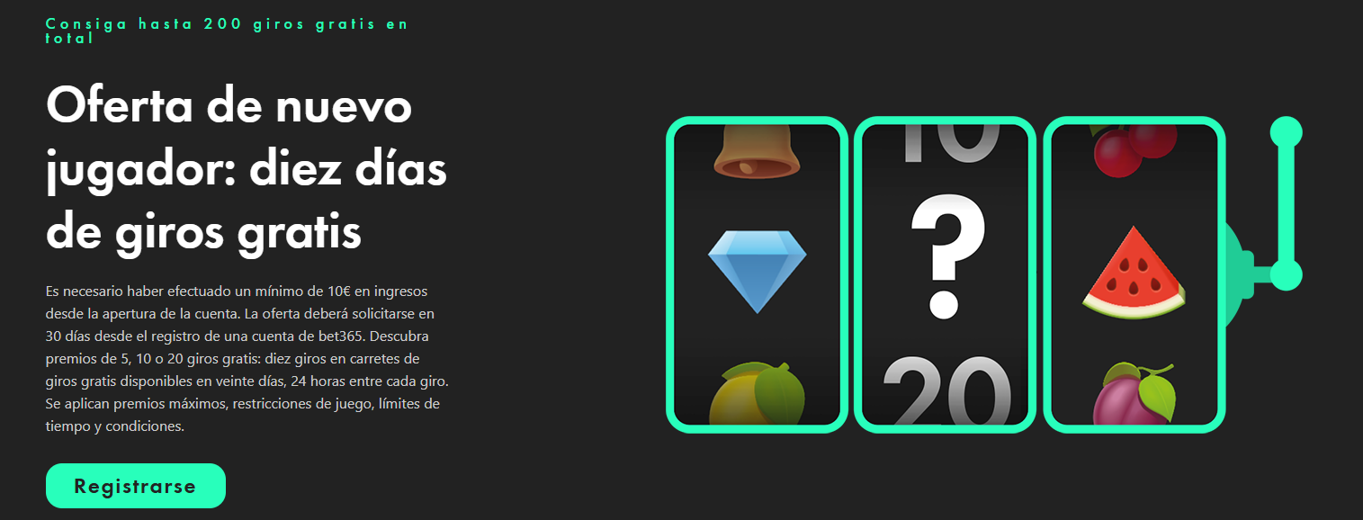 El operador de juego online líder a nivel internacional ya cuenta con un bono para los nuevos usuarios que quieran probar su casino online. Hablamos de la oferta de bienvenida para nuevos usuarios de bet365, con la que podrás conseguir nada menos que hasta 20 giros al día y un total de hasta 200 mientras dura la promoción. ¿Quieres saber cómo conseguirlos? Si es así, quédate con nosotros, vamos a contarte todo lo que necesitas saber.