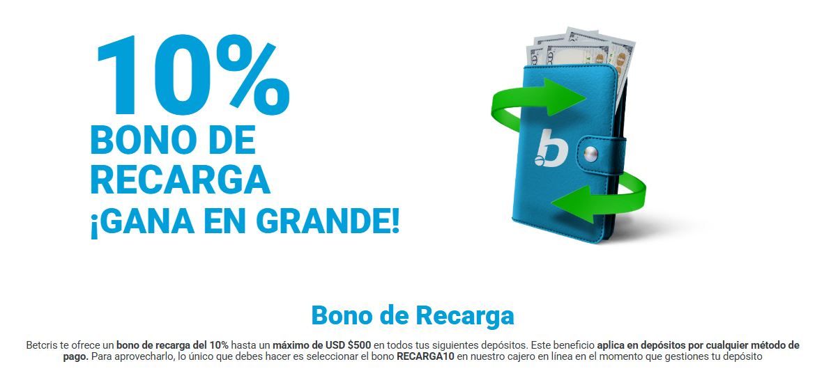 Betcris te ofrece un excelente bono de recarga del 15% en todos tus siguientes depósitos, hasta un máximo de USD $500. Esta promoción está disponible para recargas realizadas mediante cualquiera de los métodos de pago disponibles en el sitio. Para aprovecharla, simplemente selecciona el bono RECARGA15 al realizar tu depósito en el Cajero en Línea.