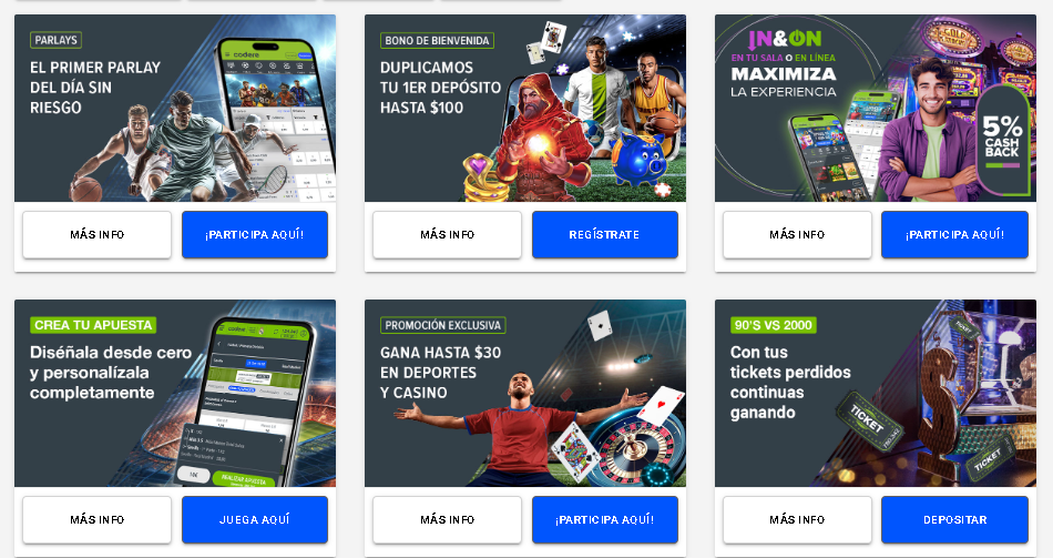 Codere es un histórico casino que ha lanzado su propia plataforma para apuestas deportivas. Tiene más de 20 disciplinas deportivas y grandiosas ofertas.