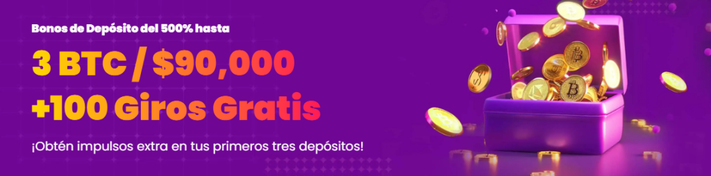 Hay un Paquete de Bienvenida que te entrega hasta 3 BTC o 90.000 USD más 100 Giros Gratis. Todo repartido en tus tres primeros depósitos.