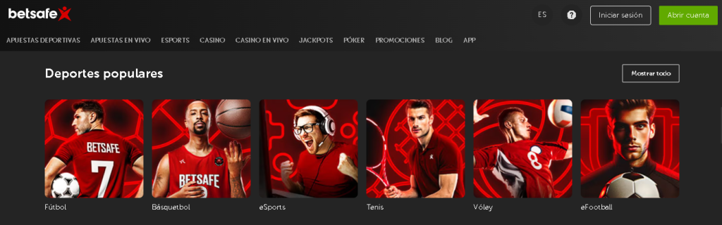 El diseño gráfico de Betsafe en muy bello. El rojo y el negro como colores predominantes forman una imagen muy interesante y además el sitio web es demasiado cómodo. La ágil navegación está garantizada, por lo que llegarás a lo que sea que busques de manera rápida y sencilla.