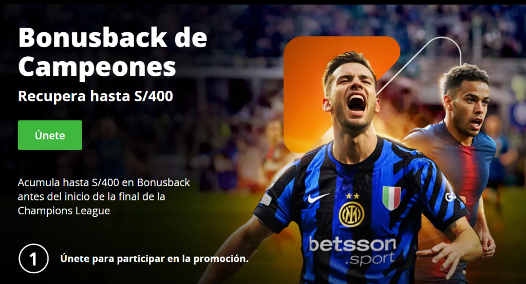 Acumula hasta S/ 400 en Bonusback antes del inicio de la final de la Liga de Campeones gracias a la Promoción de Betsson. Un espectáculo imperdible. ¡Muestra tu talento para las apuestas en Betsson Perú!