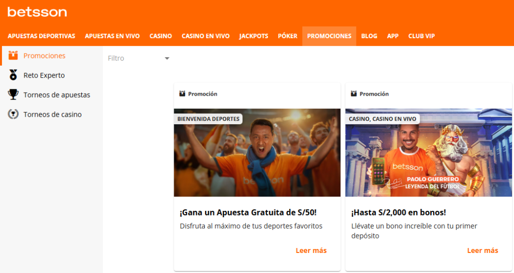 Vamos a repasar cada uno de los Bonos que Betsson ofrece en Perú, para que los aproveches al máximo y apuestes o juegues de la mano de los mejores beneficios. Si algo distingue a este sitio, es la variedad y calidad de sus promociones. ¡Empieza con hasta S/100 para Deportes o S/2.000 en el Casino!