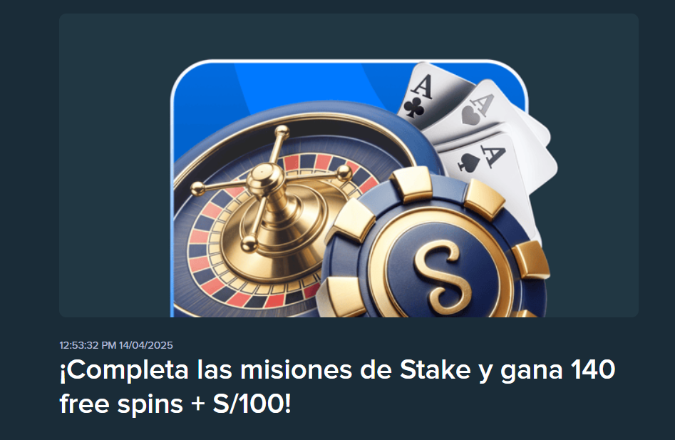 Para los fanáticos del entretenimiento, Stake propone un maravilloso evento con la Oferta «Completa las Misiones de Casino en Vivo». Abre tu cuenta en Stake Perú y participa del desafío para obtener valiosos premios y un nivel de diversión increíble.
