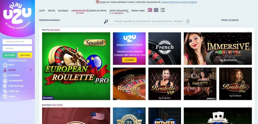 PlayUzu Perú es un casino virtual que se autodenomina y autodefina bajo el slogan “El Casino Transparente“. Presentándose como un sitio completamente seguro y confiable, está completamente comprometido con su promesa de simpleza y claridad, así como sus políticas de juego justo y seguro, e incentivo del juego responsable y divertido.