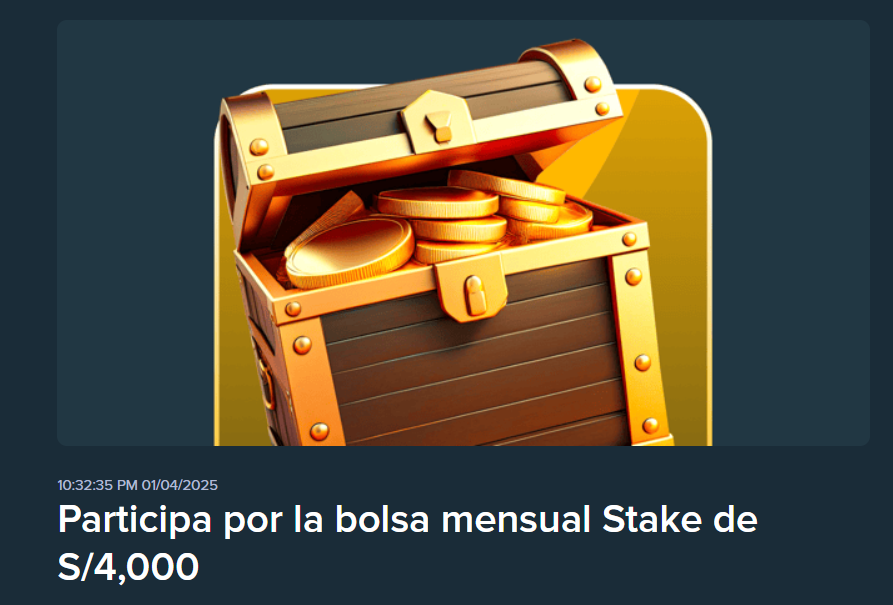 Para los fanáticos del entretenimiento, Stake propone un maravilloso evento con la Oferta «Bolsa Mensual de S/ 4,000». Abre tu cuenta en Stake Perú y participa del desafío para obtener valiosos premios y un nivel de diversión increíble.