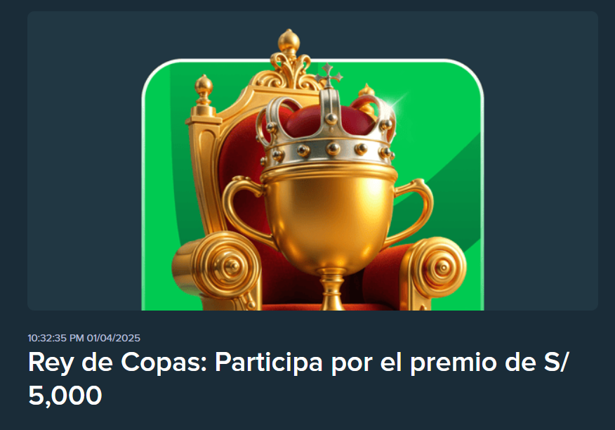 • El día 05 de Mayo de 2025 se realizará el sorteo de S/5,000 en créditos de participación de la plataforma entre los usuarios calificados a través de un generador de números aleatorios digital. Se seleccionará un beneficiado principal y dos adicionales, en caso de que el primero no cumpla con alguna de las condiciones especificadas para acceder al beneficio.