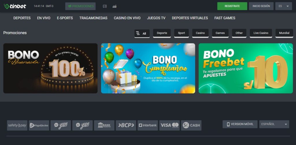 También es una ventaja Tinbet a la hora de depositar o retirar dinero. Porque trabaja con un amplio menú de métodos de pago. Algunos de ellos son SafetyPay, PagoEfectivo, Scotiabank, Interbank, Yape, BCP, BBVA, Plin, Visa, MasterCard, Bank Transfer y Banco de la Nación. Billeteras electrónicas, tarjetas de crédito/débito y también transferencia bancaria. Elige de acuerdo a lo que te resulte más cómodo.
