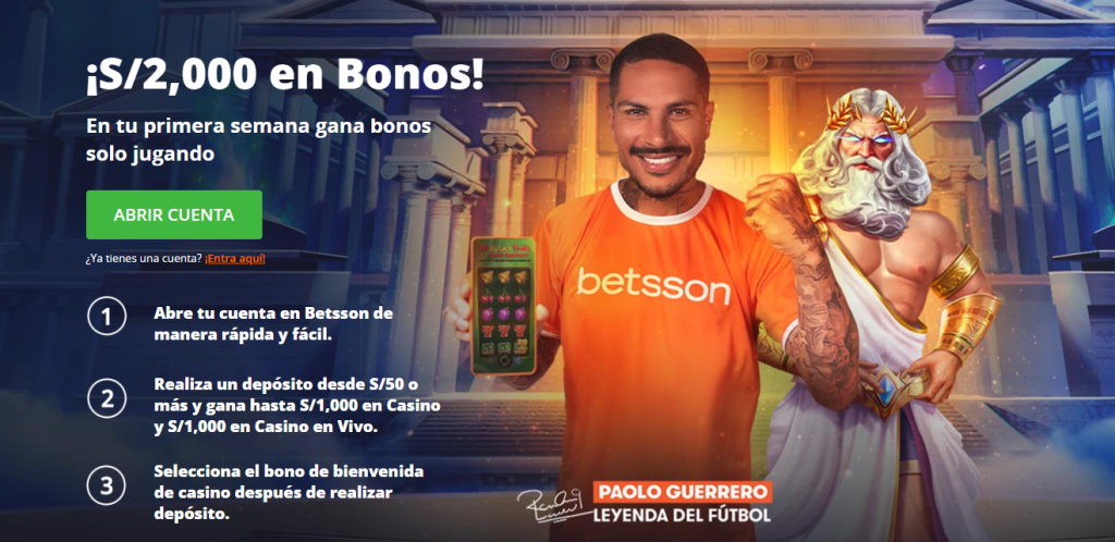 Los nuevos usuarios de Betsson Perú pueden elegir una oferta para deportes que consta de una apuesta gratis de S/50 para los deportes disponibles. Por otro lado, se encuentra vigente una espectacular promoción que entrega hasta S/2.000 en bonos para casino y casino en vivo, que se reparte en dos partes iguales para cada una de dichas categorías.