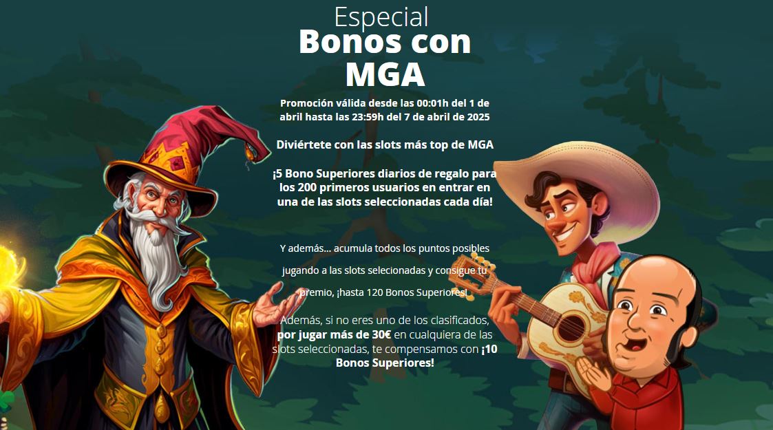 Betsson Casino ofrece una promoción Especial Bonos con MGA en la que dan 5 Bono Superiores diarios de regalo para los 200 primeros usuarios en entrar en una de las slots seleccionadas cada día.