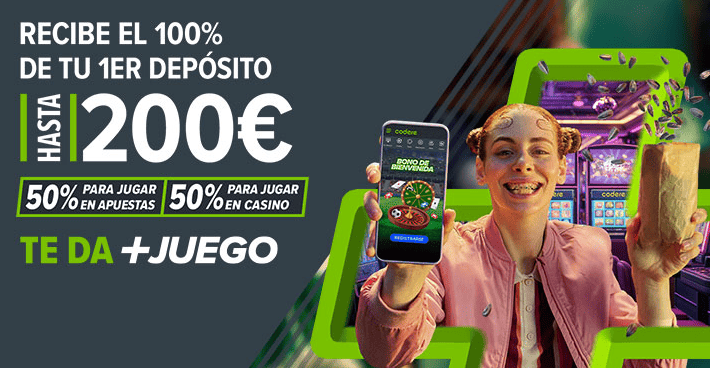 El bono de bienvenida de Codere está disponible para nuevos usuarios que accedan ahora a la casa de apuestas. Podrás conseguirlo registrándote ahora y efectuando un primer ingreso. Te bonifican el 100% del mismo, repartiendo la mitad para deportes (hasta 100€) y la otra mitad para casino (100€ máximo). De esta forma, podrás empezar a jugar con el doble del saldo que deposites. No pierdas la oportunidad de solicitarlo. Y, si quieres más información, te recomendamos que leas nuestra review sobre el Bono Codere 2025.